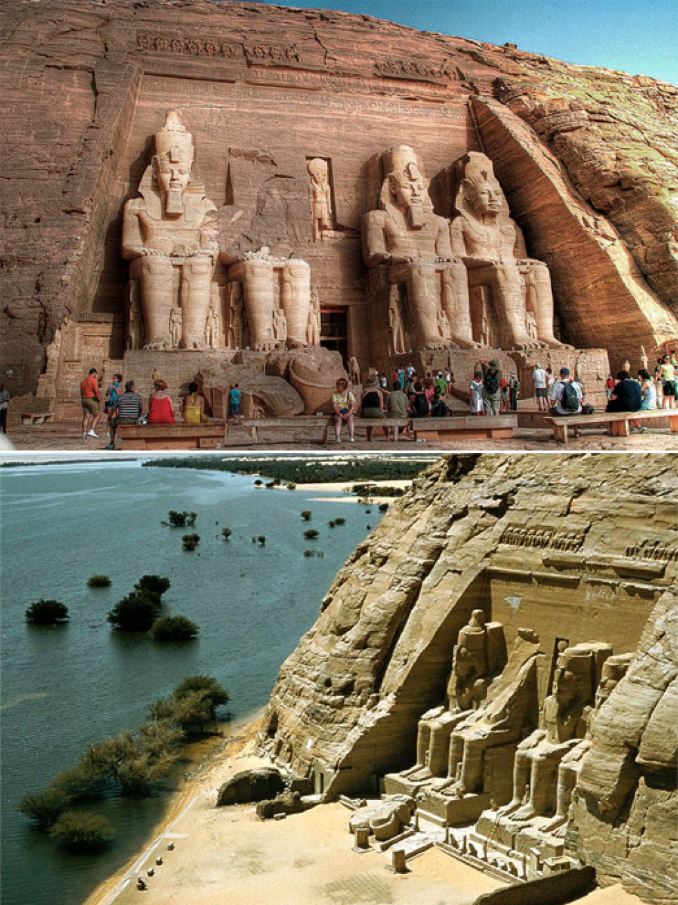 - Абу Симбел (EUR 90) - Екскурзия с автобус до Абу Симбел, разположен на западния бряг на р.Нил и на 280 км южно от Асуан. При строежа на язовир Насър, храмовете са изместени с 65 м по-високо от оригиналното им място. Там се намират двата, изсечени в скалите древноегипетски храма с изключително красива и внушителна фасада от времето на Рамзес ІІ (около 13 в. пр.н.е), след победата му при Кадеш. Големият храм е посветен на бога-слънце РА, на боговете Хор и Птах. Образът на Рамзес доминира в цялостната украса на храма и излъчва божествено могъщество. Съвсем наблизо до Големия храм се намира т.н. Малък храм или храмът на Хатхор (Hathor) и Нефертари (Nefertari). Това е първият в историята на Египет храм, посветен на царица. В допълнение, големината на женската статуя е същата като на Рамзес, противно на обичаите статуите на жените и децата да са с много по-малки размери. Храмовете са изключителна забележителност, а историята им повече от впечатляваща. Храмовия комплекс днес е под закрилата на ЮНЕСКО.
