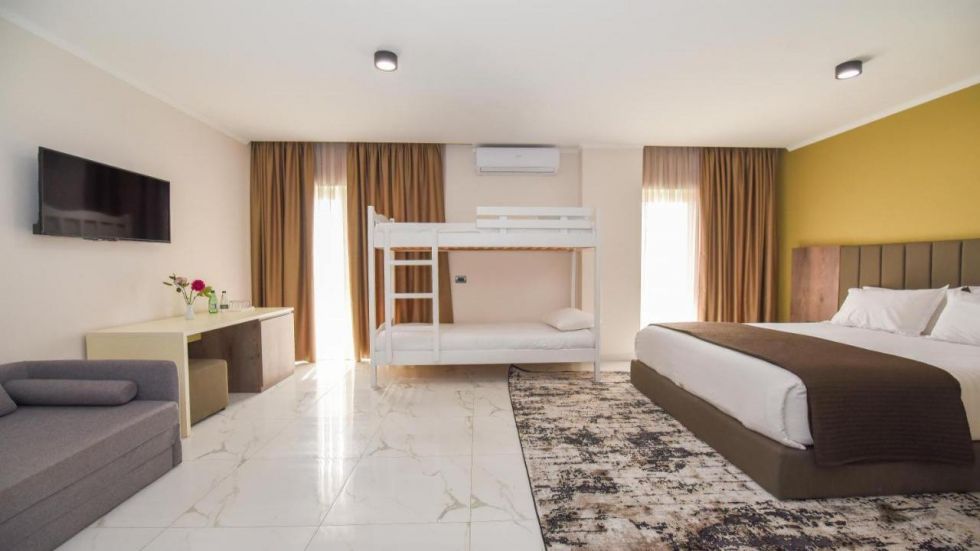 Фамилна или четворна стая: Този вид стаи разполагат с 1 двойно легло и 2 единични легла. Подходящи са за семейства, стаите са просторни. Разполагаме с 8 четворни стаи, като 6 от тях са с изглед към морето. Стаите разполагат с: