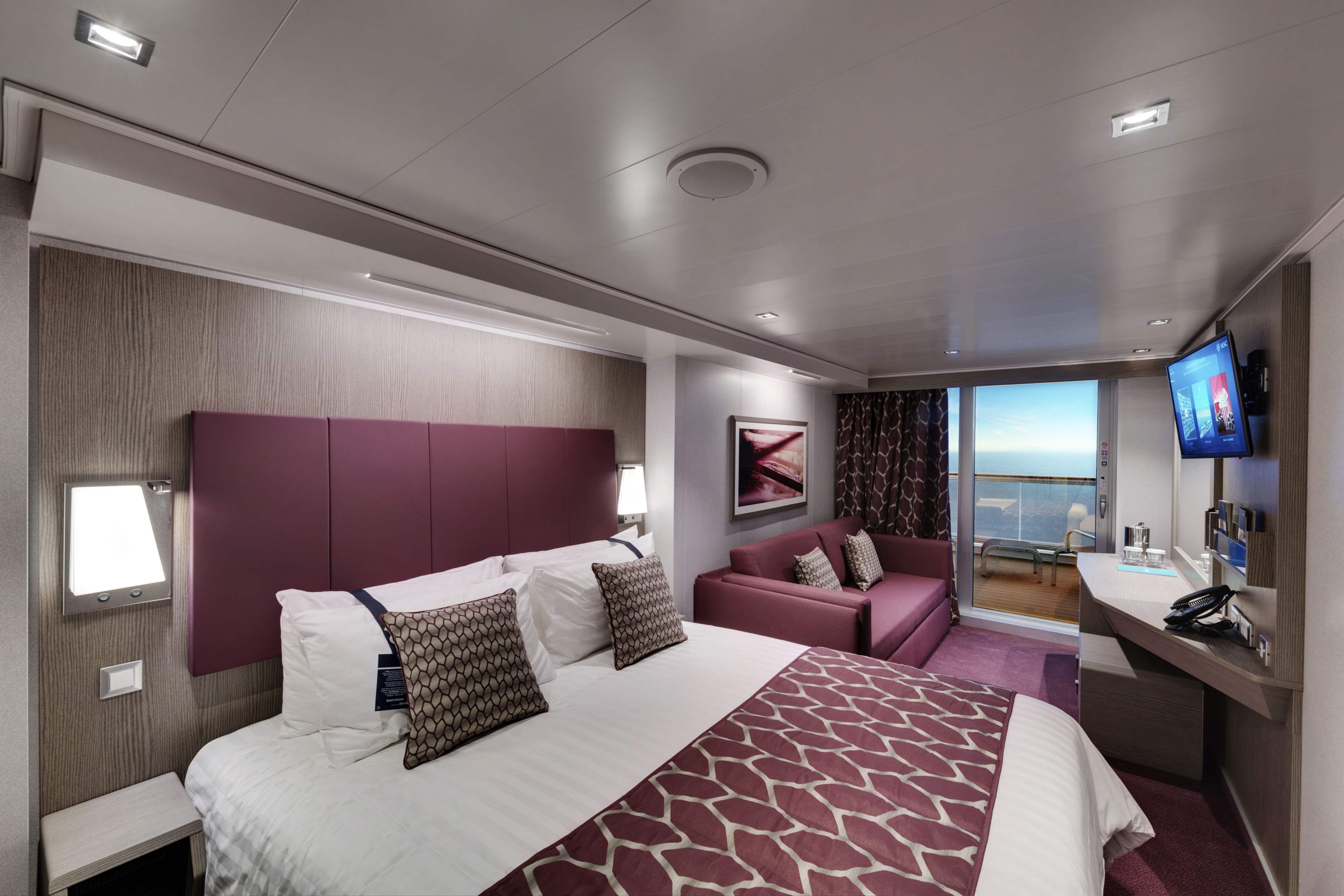 Суити с джакузи, каюти с балкон, каюти с прозорец / не се отваря /, вътрешни каюти, каюти за инвалиди. Всички с интерактивна ТВ, телефон, сейф, минибар, климатик, интернет срещу заплащане.