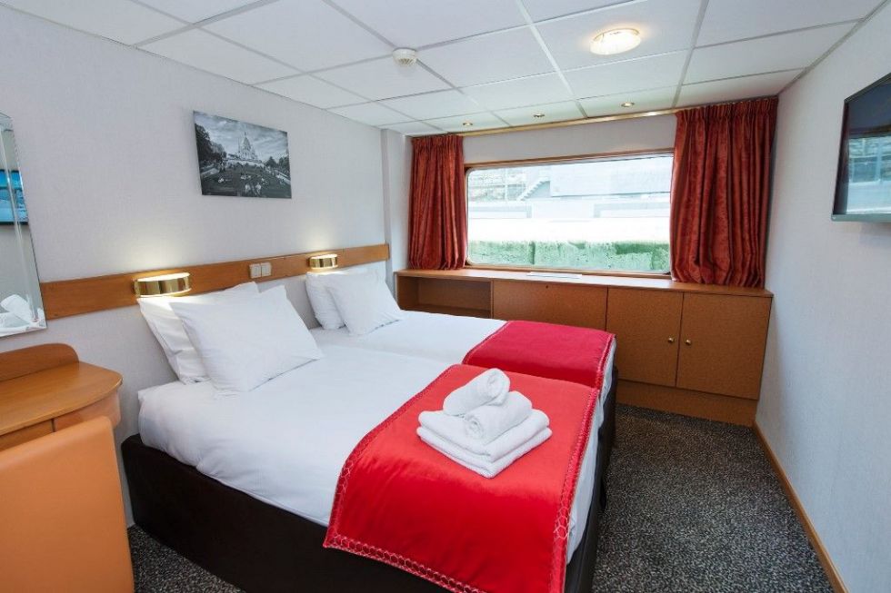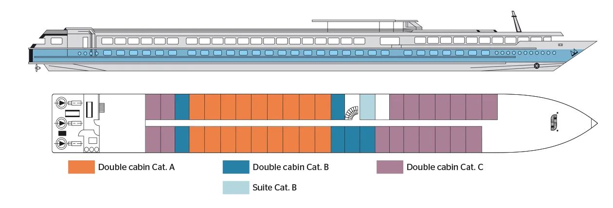 Каютите са общо 67, разпределени на 2 палуби, с площ около 12.50 кв. м. На основната има общо 43 каюти с прозорец. На горната палуба се намират 24 кабини с отварящи се в горната част (плъзгащи) прозорци.