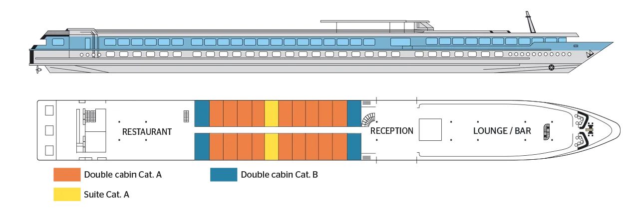 Реновиран през 2015 г., круизният кораб разполага с ресторант, бар, слънчева тераса с шезлонги.