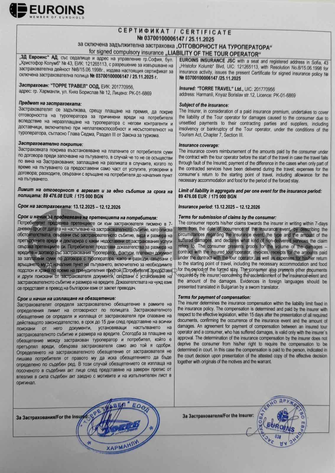 Лиценз и застраховка "Отговорност на туроператора" на фирма "Торре Травел" ЕООД